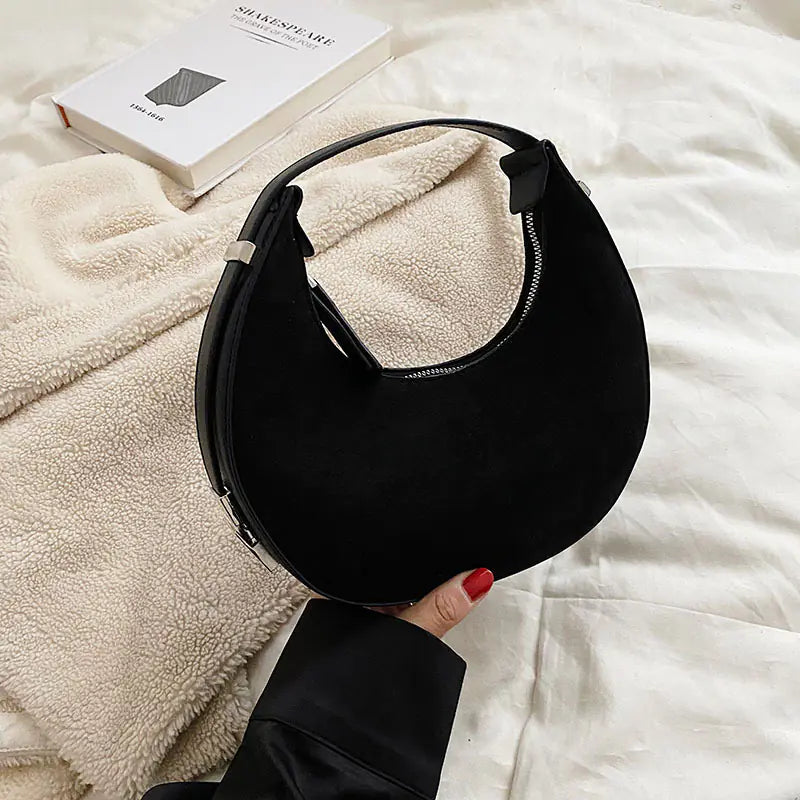 Elevate your accessory game with this handbag that features a unique crescent shape and textured finish, ensuring you stand out in any crowd.
