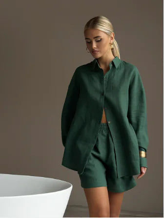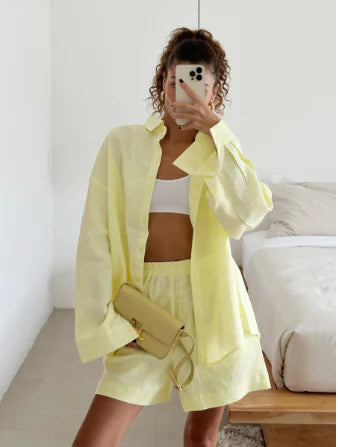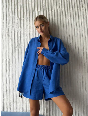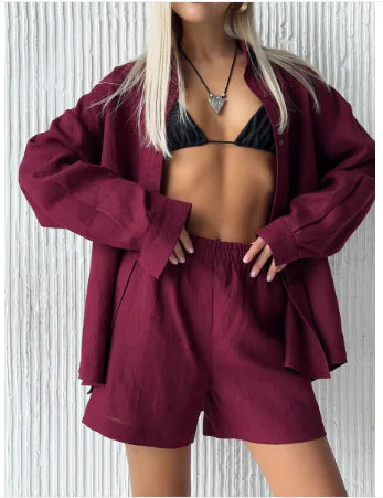 Stay stylish and comfortable with this women's set featuring a long sleeve button cardigan and matching shorts. Made from lightweight polyester, perfect for spring and summer. Available in a variety of solid colors and sizes S–XL. Includes shirt & shorts.